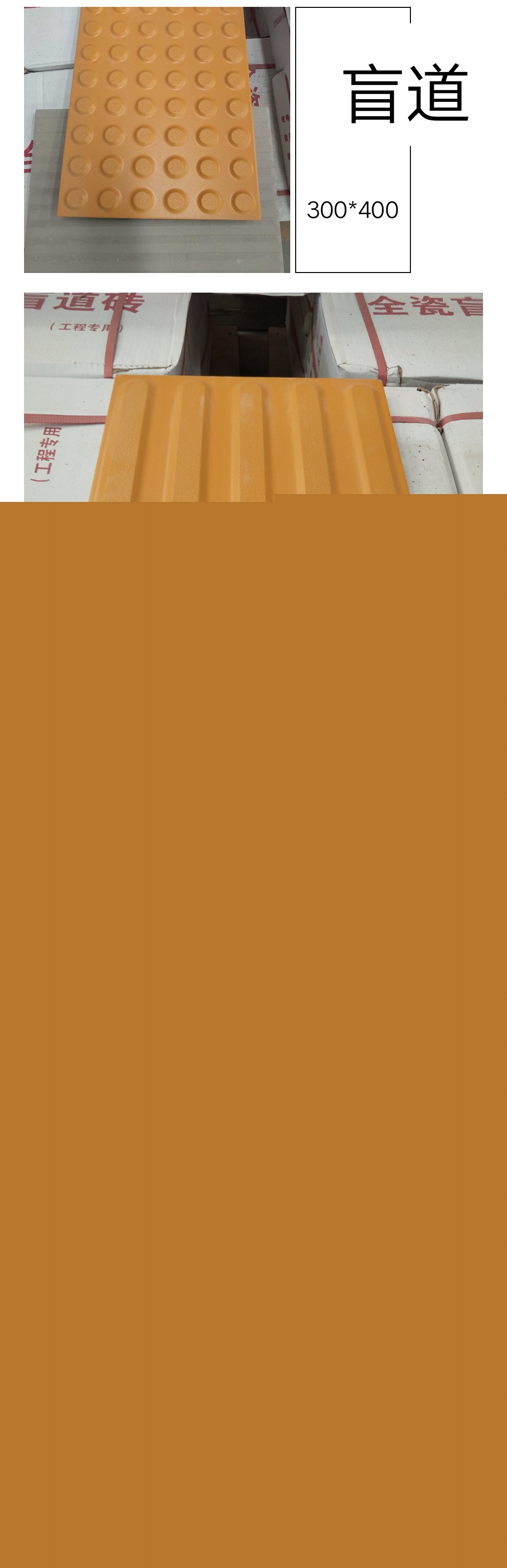 盲道磚規(guī)格:298*298、299*299、300*400、400*400、398*398(其它規(guī)格可以定制),白色安全線規(guī)格600*100